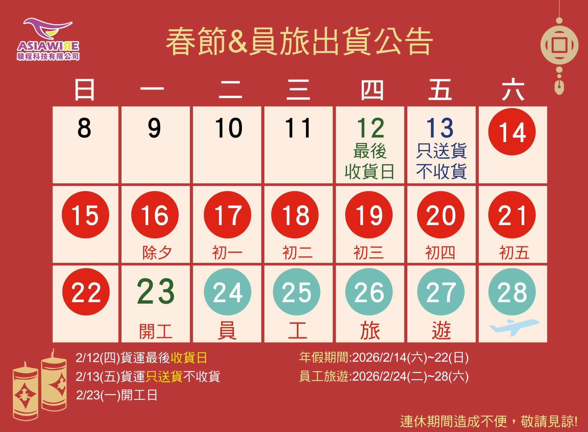 春節&員旅出貨公告